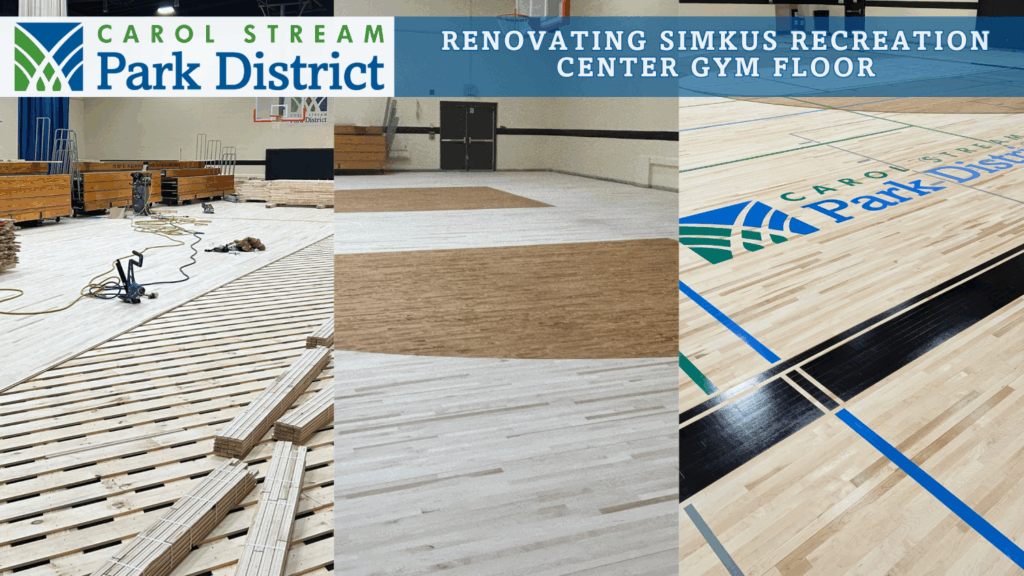 We are in the process of redoing our gym floors here at Simkus Recreation Center, and we have some UPDATES! The Gym is expected to reach completion late December 2025, earlier than expected. The new flooring has been installed and lines and logos have been painted. We begin the sealing process today – Nov 21.
