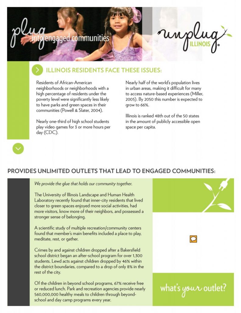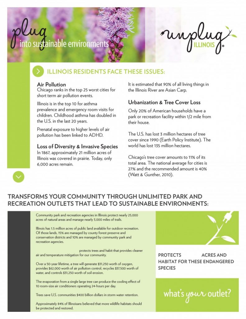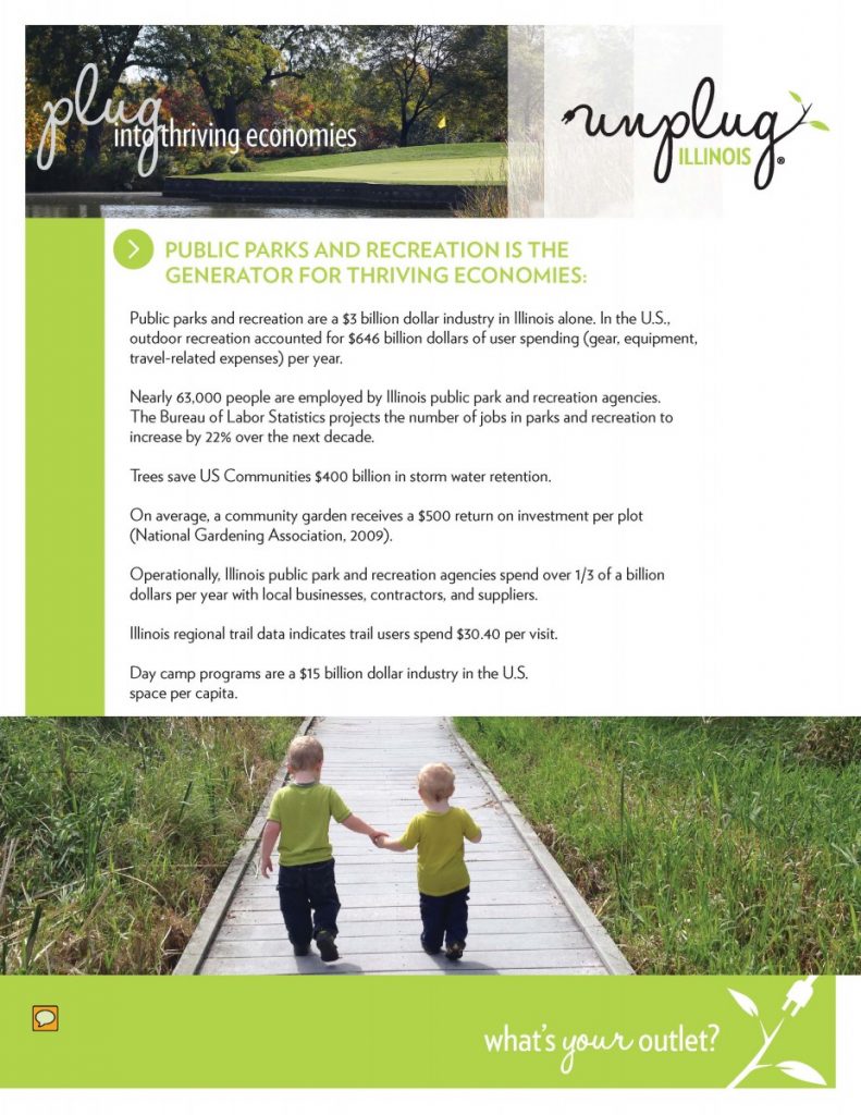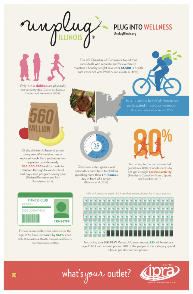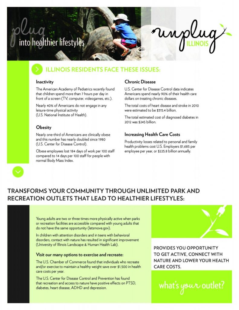 Unplug Illinois is an effort to communicate and educate communities about the value of parks and recreation. Your Park and Recreation agencies provide unlimited “outlets” that lead to Healthier Lifestyles, Sustainable Environments, Thriving Economies, and Engaged Communities. We want you to “unplug” from the daily grind and allow yourself to “recreate”.