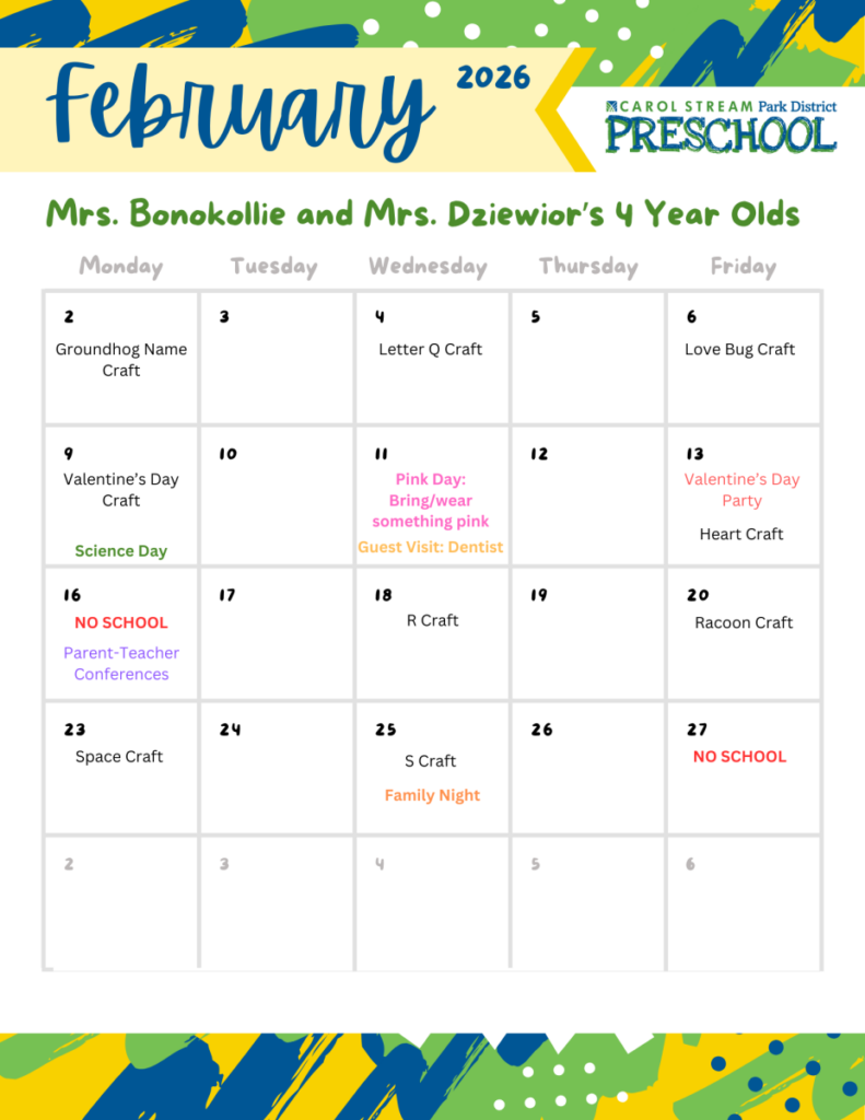 Mrs. Bonokollie has been teaching at the park district preschool for 9 years. She has also lived in Carol Stream for 10 years. She has 4 children, 1 puppy and a cat. In her free time Mrs. Bonokollie likes to read.