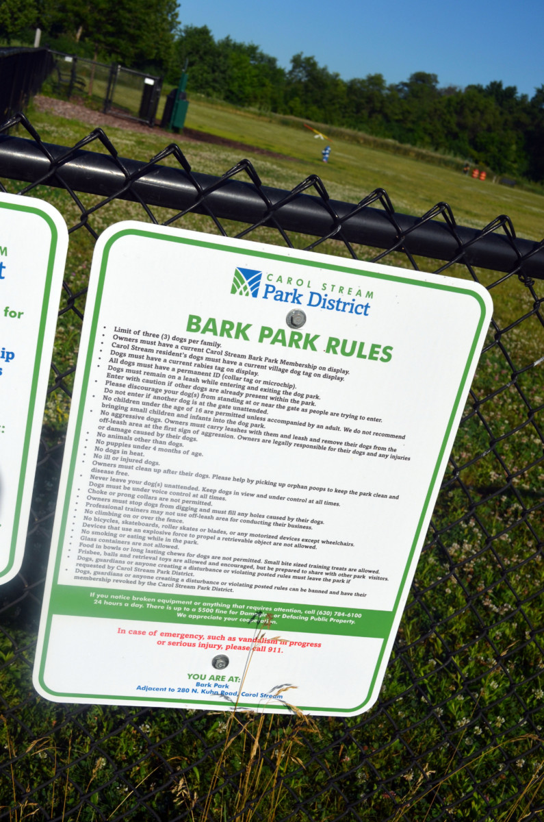 Dogs, guardians, or anyone creating a disturbance or violating posted rules must leave the park if requested by Carol Stream Park District.