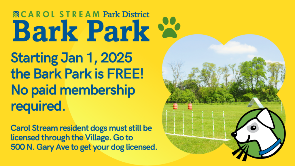 Dog lovers and their four-legged friends revel at the off-leash dog park, Bark Park, which features large and small dog play areas with agility equipment. Carol Stream’s off-leash dog park includes fenced play areas for large and small dogs. Parking is available at Volunteer Park off Kuhn Road. No water is available at the dog park, so bring a water bottle and bowl for your pets.