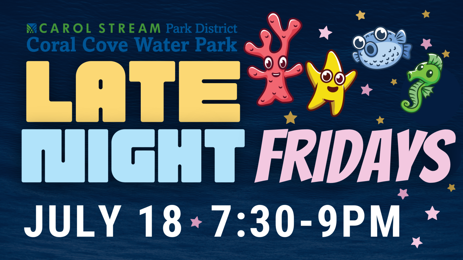 Coral Cove is staying open late on Friday, July 18! Enjoy extended hours with access to the splash pads and dry playground. Please note that the main pool, dive well, and high slide well are temporarily unavailable due to a mechanical issue, but they’ll be back open tomorrow.