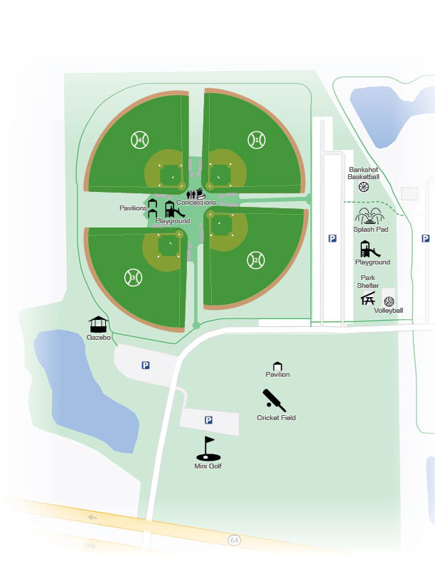 • A paved walking and biking trail loops the fields and connects to neighboring trail systems.