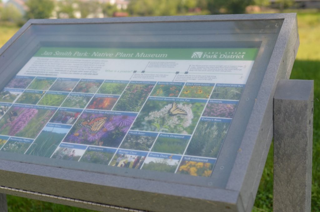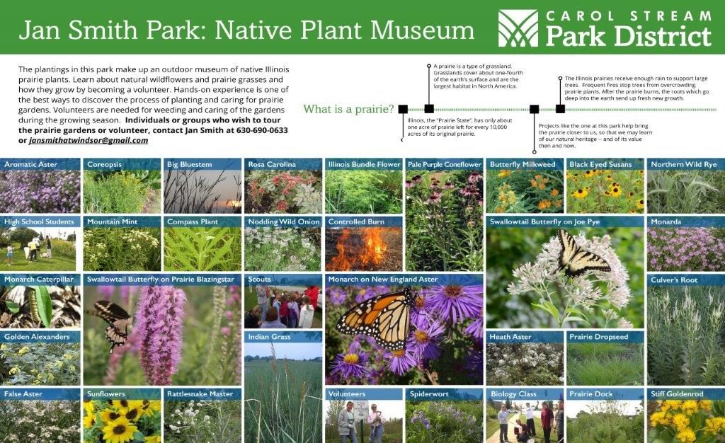 Jan Smith Park is a four-acre outdoor museum of native Illinois prairie plants. Each fall, on the annual harvest day, local gardeners collect the seeds and take them home to use in their gardens. The park is also a certified Monarch Butterfly Waystation.