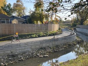 Memorial Park, located at 342 Thunderbird Trail, is the first park the Park District acquired in 1967. Klein Creek runs through the park, and over the years, the shoreline has been slowly eroding. The Village of Carol Stream has been restoring and stabilizing the Klein Creek shoreline. The project started in 2017 and was split into four sections, one that included Memorial Park and that stretched to Kuhn Road. These photos illustrate the retaining walls constructed to stabilize the erosion of Klein Creek. Additionally, the Village constructed a new pathway that weaves from Memorial Park to Kuhn Road. Crossing Kuhn Road, the next trail takes you underneath North Avenue to Red Hawk Park and onto the Great Western Trail. This is just another example of the many trails and paths we have in Carol Stream, throughout the Village and Parks, that offer residents exploration and adventure.