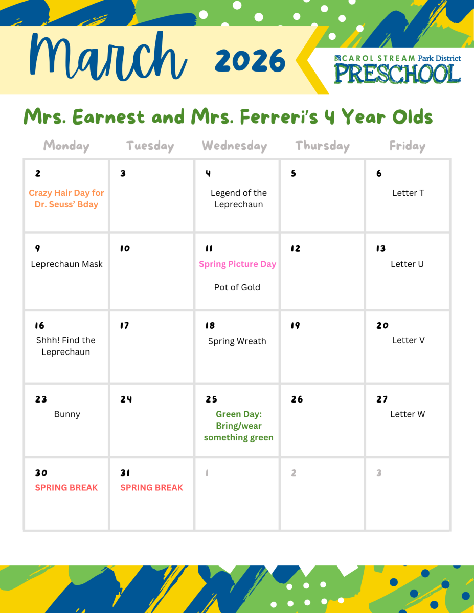 Mrs. Earnest started working for the Carol Stream Park District in 1989 and is celebrating her 35th work anniversary this year! She is a Carol Stream native and spent many years walking to the job regardless of the weather. In 35 years of working with children, Kathy has not lost sight of the fun and wonder they bring. She approaches every celebration, special holiday or preschool activity with the excitement of a brand new experience, so that every single student can capture a special memory.